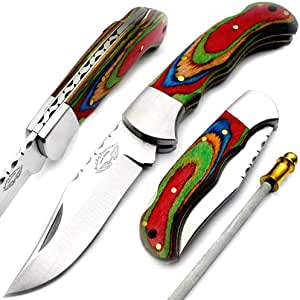 Best.Buy.Damascus1 Multi Wood 6.5'' Sliver Bloster Handmade Stainless Steel Folding Pocket Knife with Sharpening Rod & with Back Lock 100% Prime Quality
