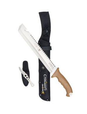 The Camillus Carnivore X is an 18″ fixed blade machete with a 12″ Titanium Bonded 420 stainless steel blade, designed for cutting, digging, sawing, chiseling, and gutting. The partial serrated edge adds utility, while the Titanium Bonding increases hardness and edge retention. Includes a ballistic nylon sheath and a removable trimming knife with its own sheath. Handle is constructed with durable ABS.