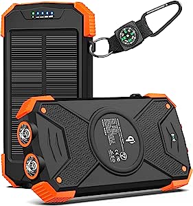 BLAVOR Solar Charger Power Bank, Qi Wireless Charger 10,000mAh External Battery Pack Type C Input Output Dual Super Bright Flashlight, Compass Carabiner, Solar Panel Charging (Orange)